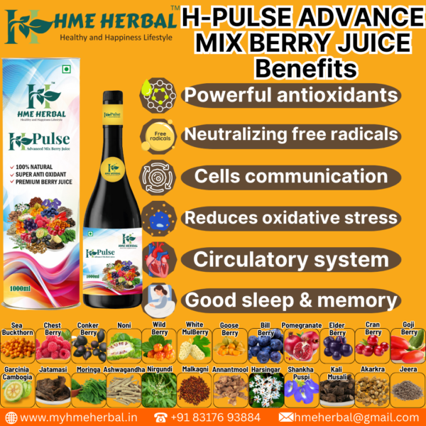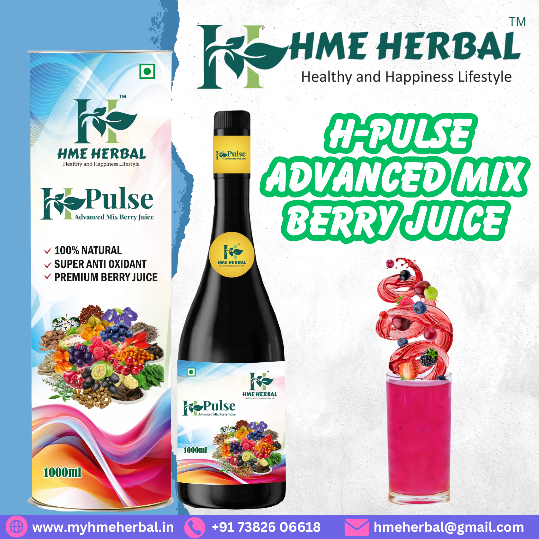 HME Herbal H Pulse Advanced Berry Juice is a premium health drink crafted from a unique blend of berries, offering an invigorating boost to your daily wellness routine. With a generous 1000 ml package, this juice provides a rich source of antioxidants and essential nutrients.